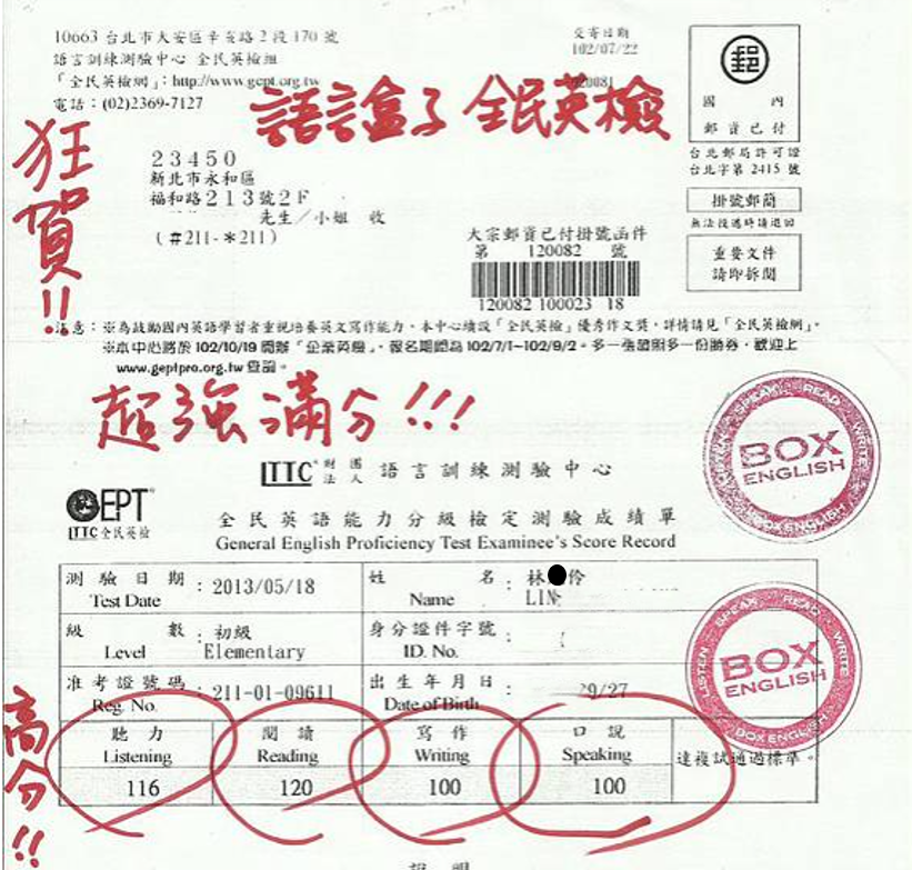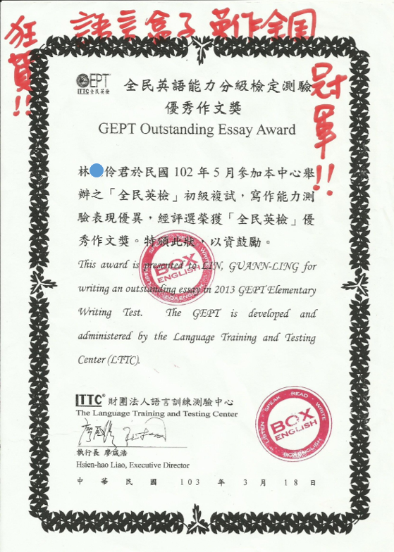 本班學生林O伶(永和國中815)榮獲GEPT全民英檢初級優秀作文獎~英文寫作測驗從十萬考生中脫穎而出!閱讀、寫作、口說滿分!