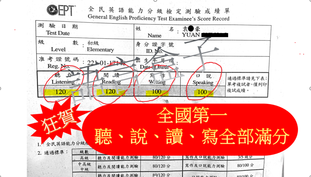 本班學生袁O豪(師大附中國中部145)榮獲全民英檢全國冠軍,聽 說 讀 寫全部滿分