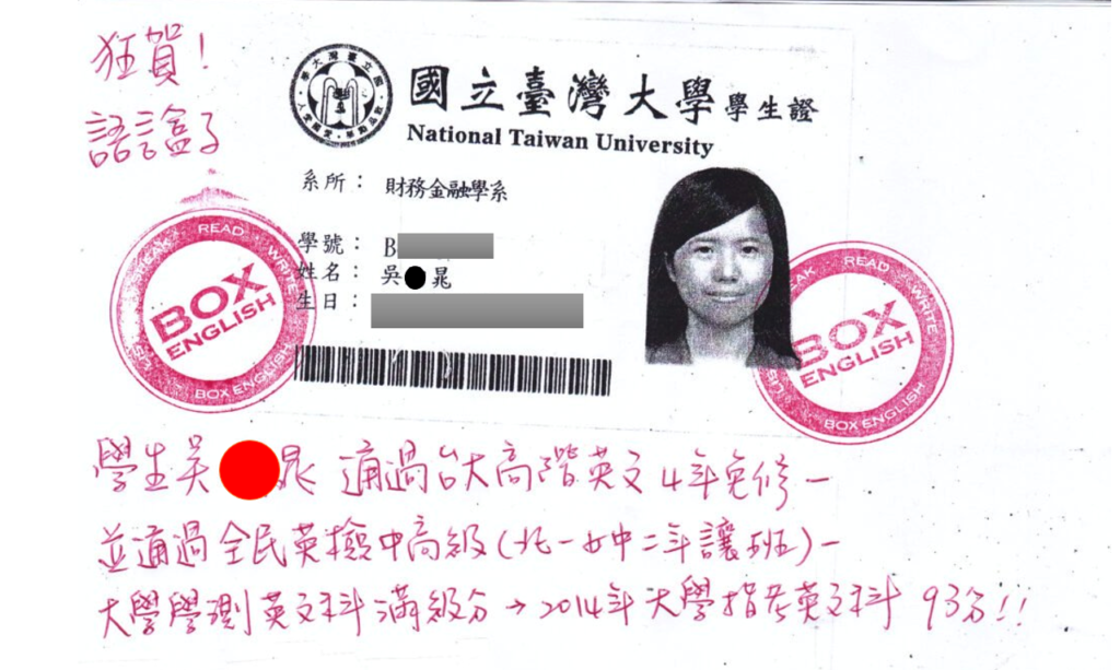 (黃昱嘉同學從小在語言盒子開啟英文的啟蒙~ 直到基測以408分考上北一女(基測滿分